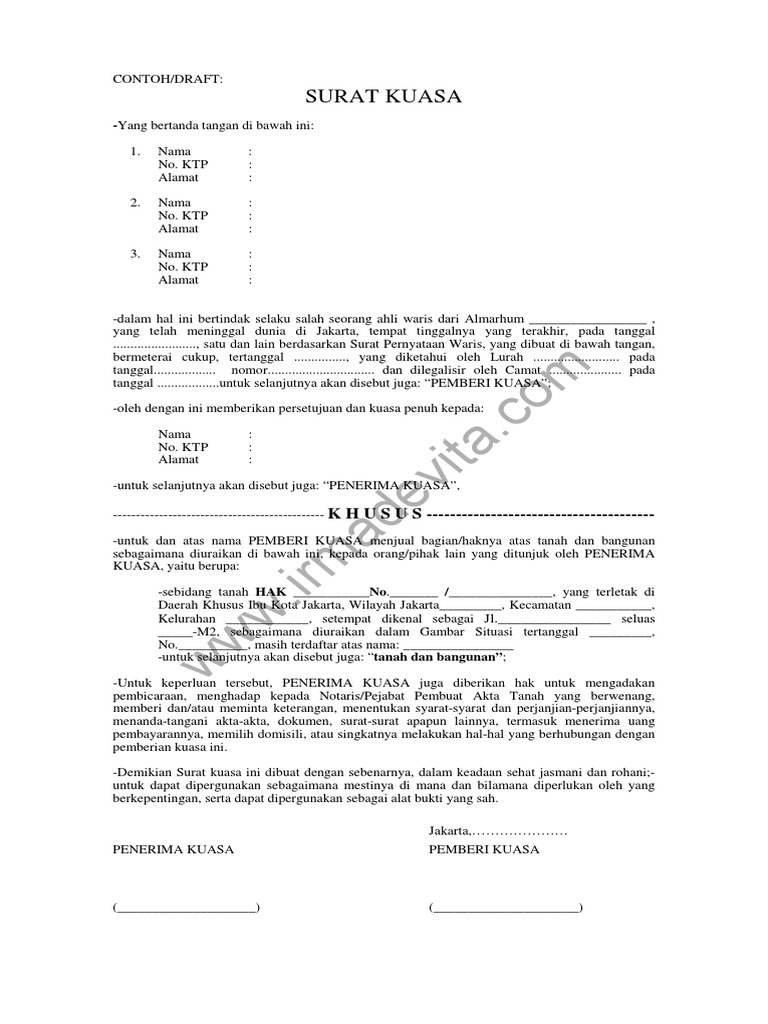 Surat kuasa pada dasarnya merupakan surat keterangan dari seorang pemilik kuasa yang memberikan kuasa yang ia miliki pada orang lain. Semoga dapat di jadikan referensi serta memberikan manfaat yang luar biasa bagi anda. Begitu juga ketika seorang pimpinan perusahaan harus memberikan kewenangan sementara kepada staf yang dipercaya untuk mewakilinya. Jika masih bingung dengan formatnya, contoh ini bisa anda jadikan panduan. Ada masanya ketika kita harus berhadapan dengan urusan jual beli tanah atau rumah dan membutuhkan surat kuasa ahli waris tanah atau rumah tersebut karena.